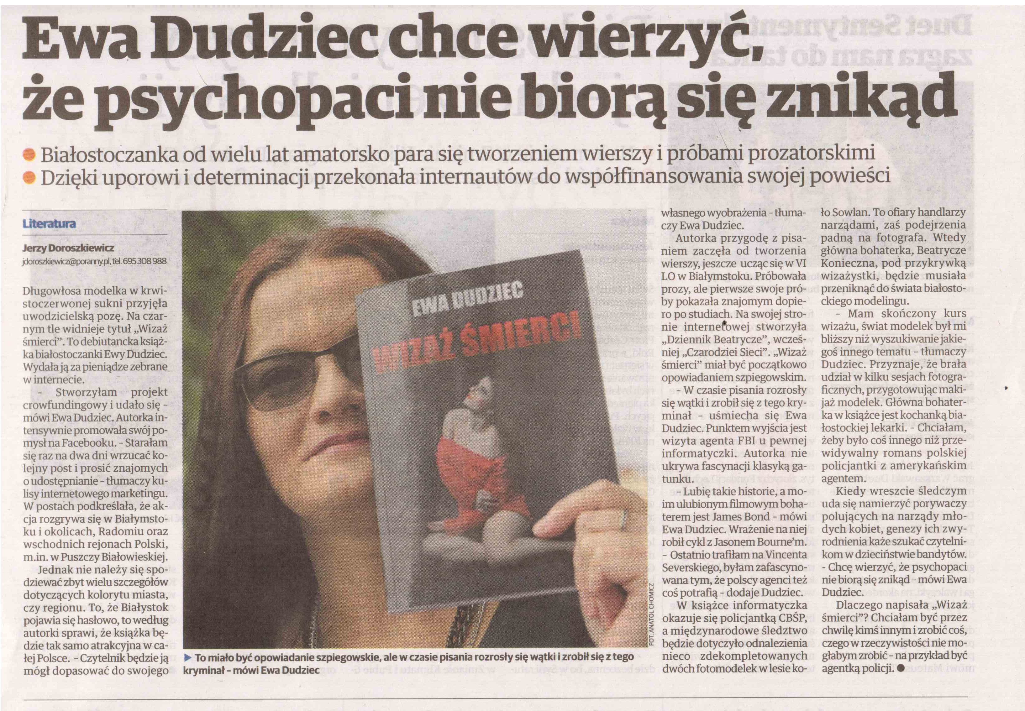 Z duszą na ramieniu czekałam na dzisiejsze wydanie gazety. Trzy tygodnie temu dziennikarz “Porannego” zauważył moją książkę na wystawie w księgarni i napisał do mnie maila. Zupełnie nieświadom tego, że kilka miesięcy wcześniej ja pisałam do redakcji z prośba o patronat medialny. Wtedy dostałam odpowiedź, że patronatu się nie podejmą, ale jak już wydam “Wizaż śmierci”, to chętnie przeprowadzą wywiad.